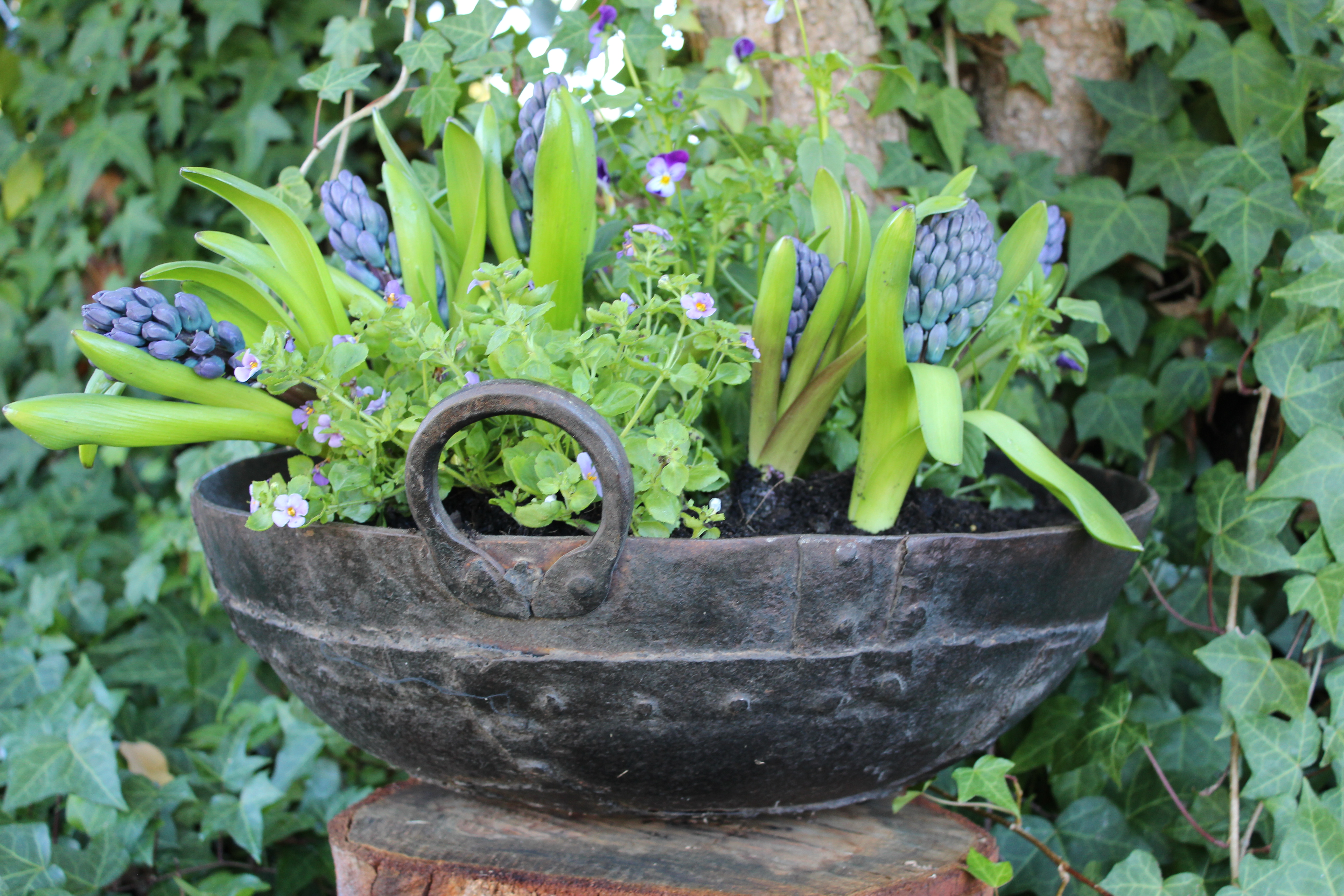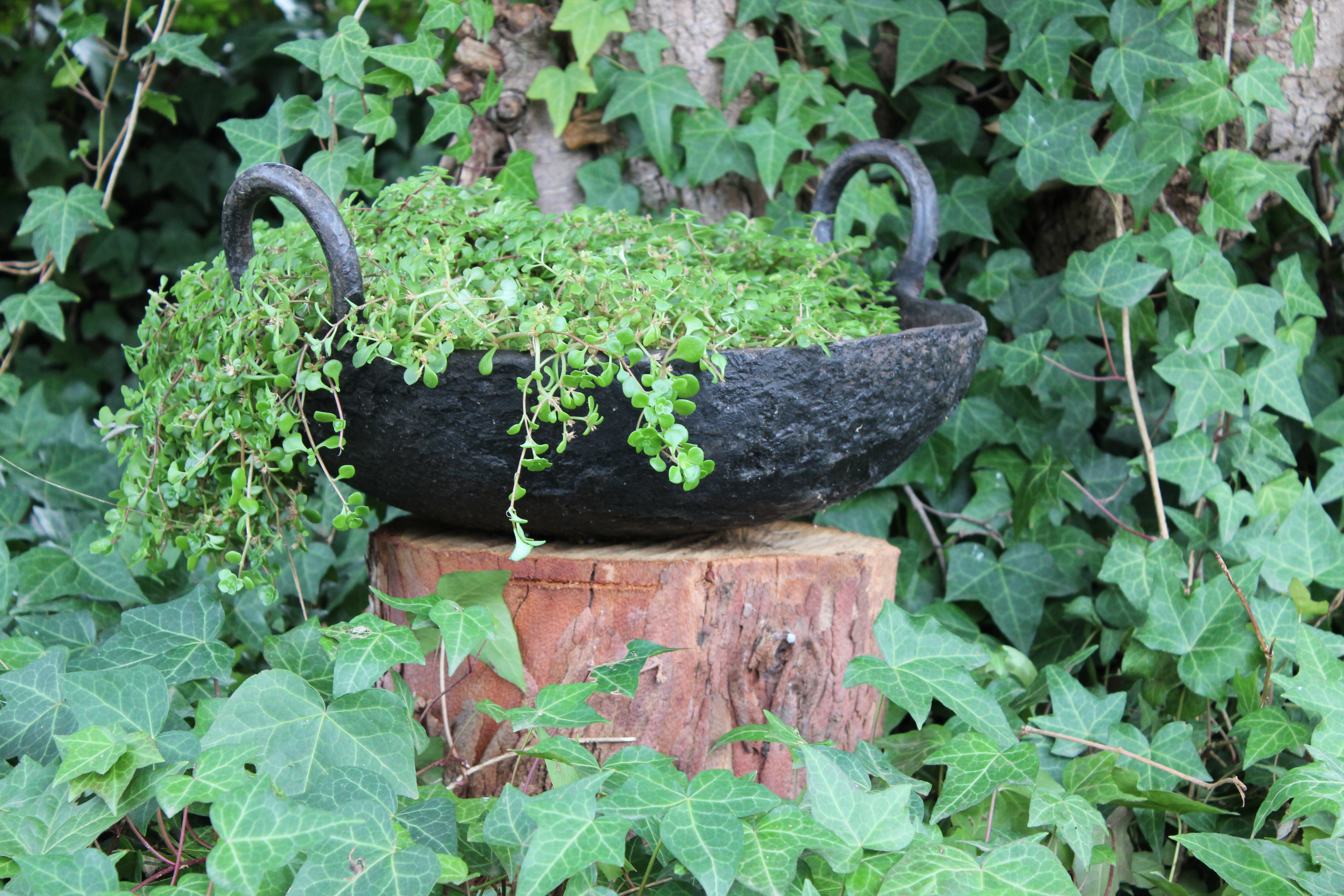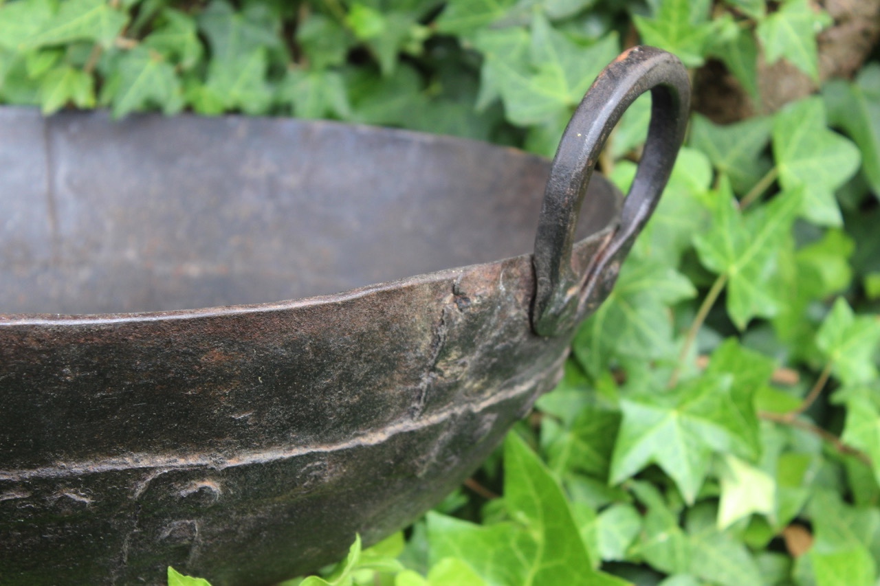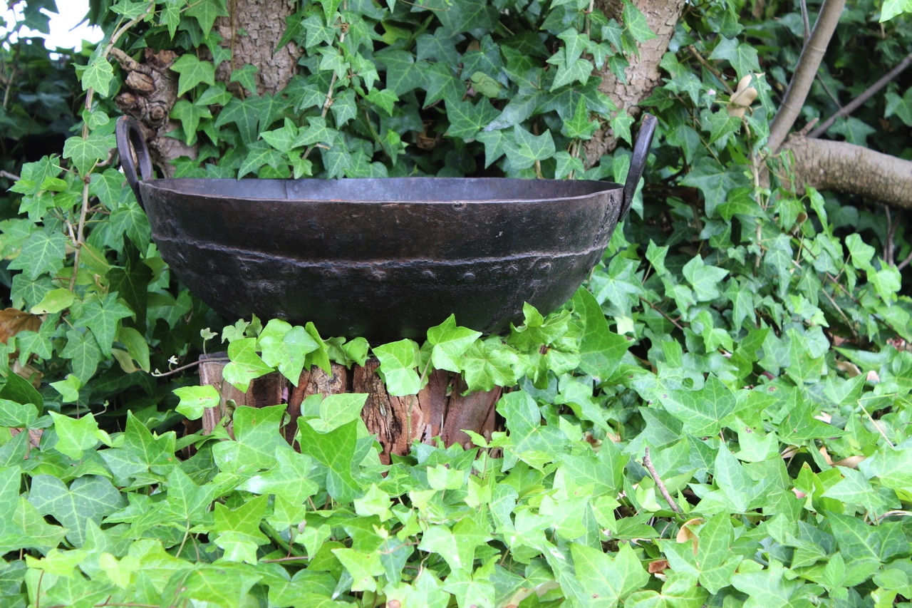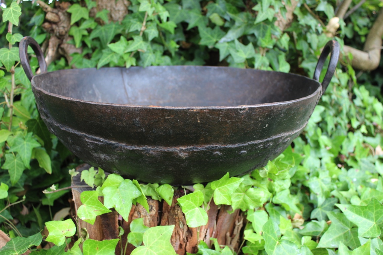 Unique, Indian cooking bowl repurposed as a planter. Suits bonsai, succulents, flowering bulbs and smaller plants like pansies. Bright green foliage contrasts beautifully against the iron.